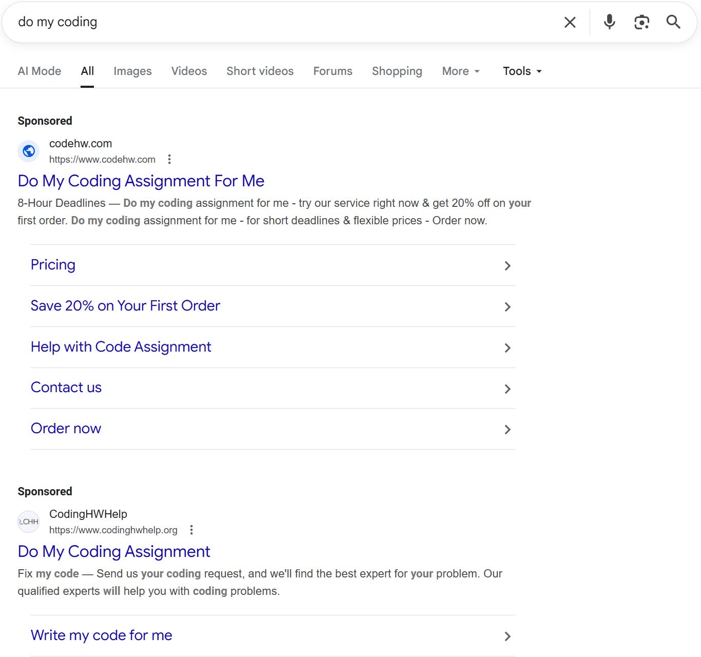 NOTE: In my search, I was served two essay mills (codehw and codinghwhelp), click both or one!
